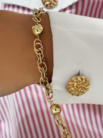 Bransoletka ze złota 585 o wyrazistym splocie, z dekoracyjnymi kulkami. Solidna i efektowna, z praktycznym zapięciem na karabińczyk. Idealna do codziennych i eleganckich stylizacji.