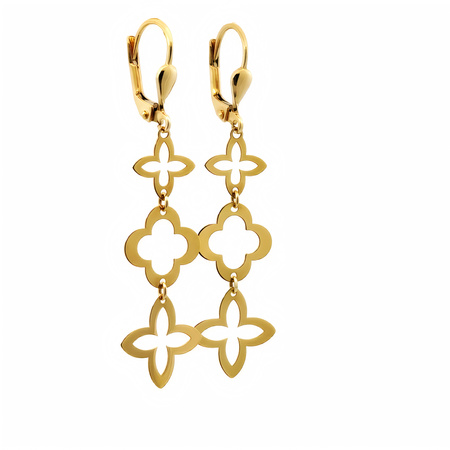 - Złote kolczyki ze złota próby 585 z angielskim zapięciem, w kształcie koniczyny i kwiatka. Ażurowe, z płaską i błyszczącą powierzchnią. Klasyczne i eleganckie, idealne na prezent.